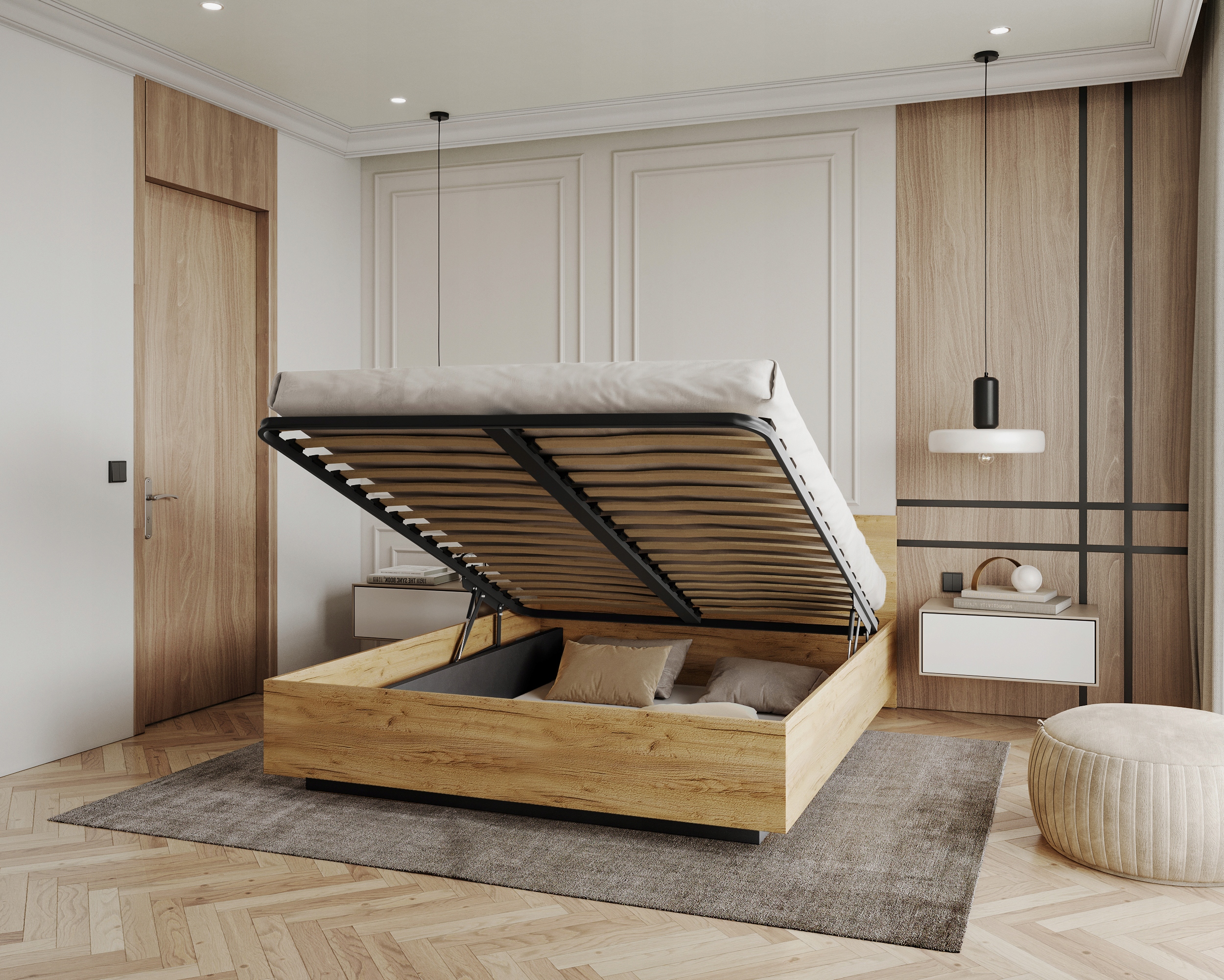 dzięki ukrytej ramie, umieszczonej w podstawie łóżka uzyskujemy nowoczesny efekt, który wyróżni wnętrze Twojej sypialni.