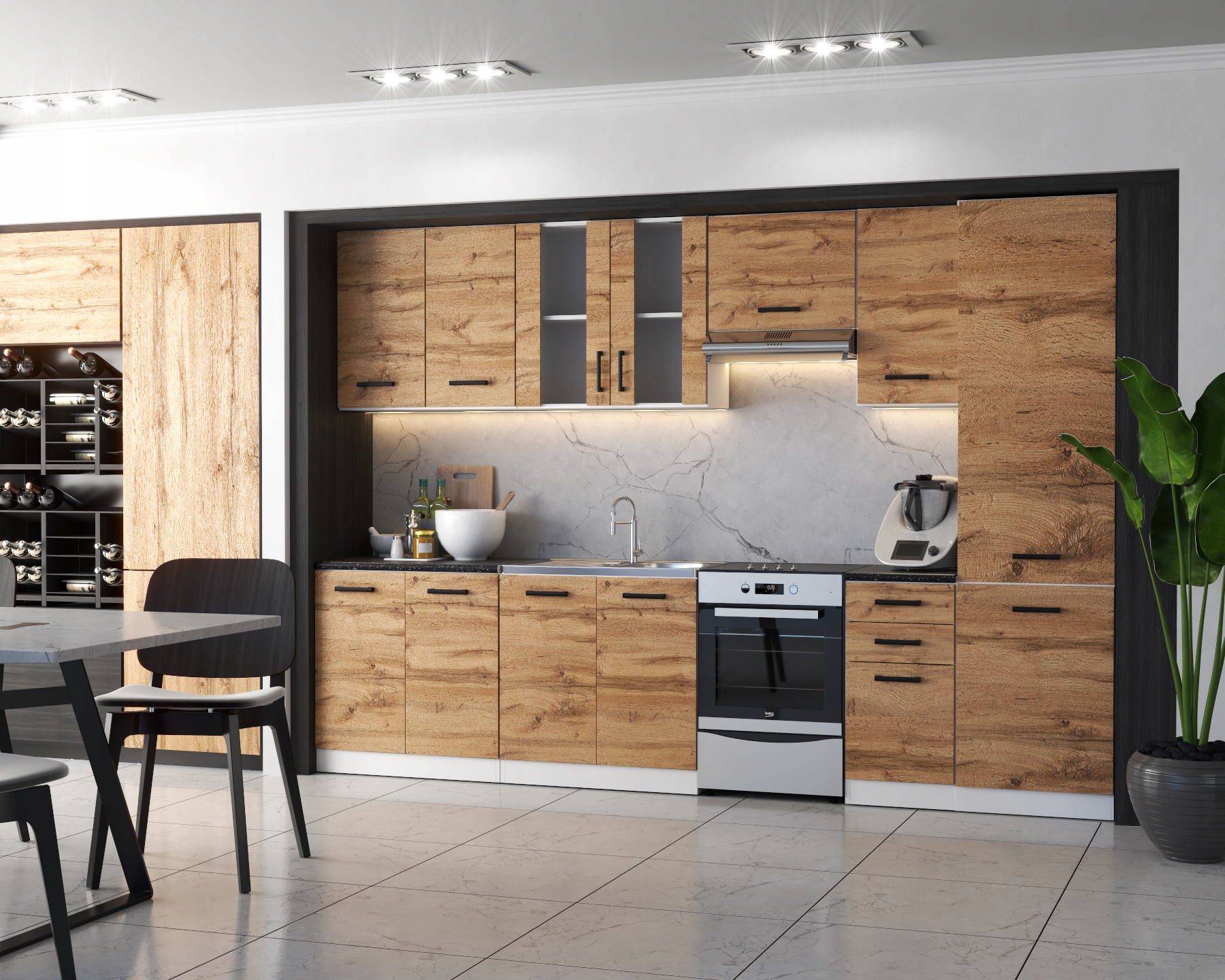 • Modularność: Zestaw meblowy jest elastyczny i modułowy, co umożliwia dostosowanie go do indywidualnych potrzeb i wymiarów kuchni, zapewniając optymalne wykorzystanie dostępnej przestrzeni.